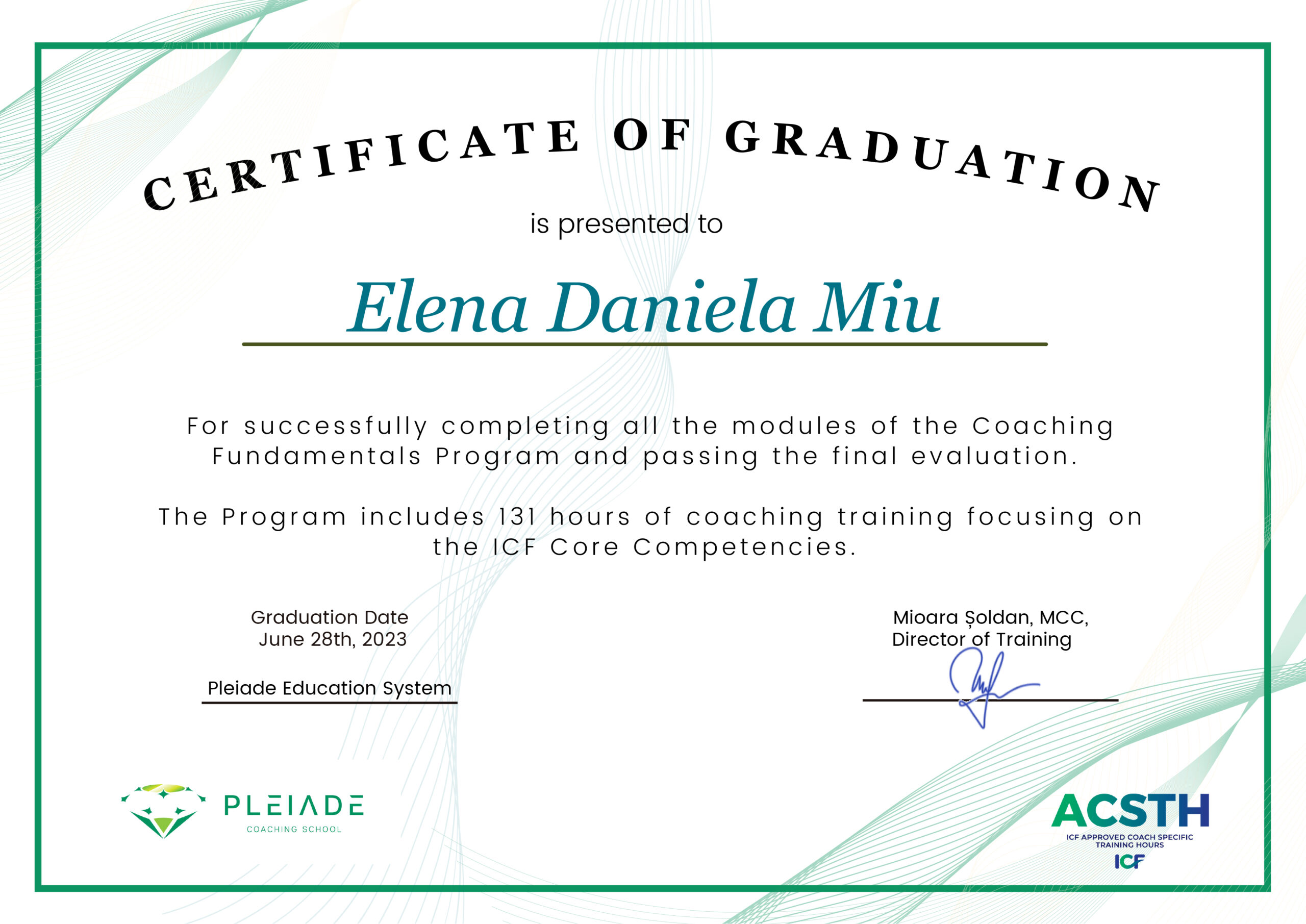 Sunt absolventă a școlii Pleiade Coaching School, o instituție recunoscută și acreditată de International Coaching Federation (ICF).