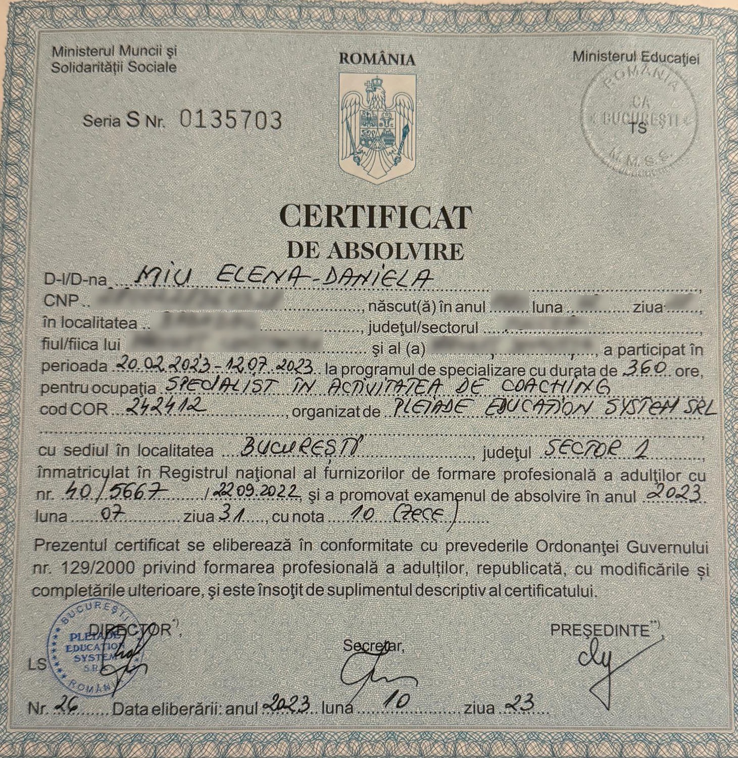 De asemenea, am obținut și acreditarea ANC de „Specialist în activitatea de coaching” conform Certificatului de absolvire emis de Ministerul Muncii.